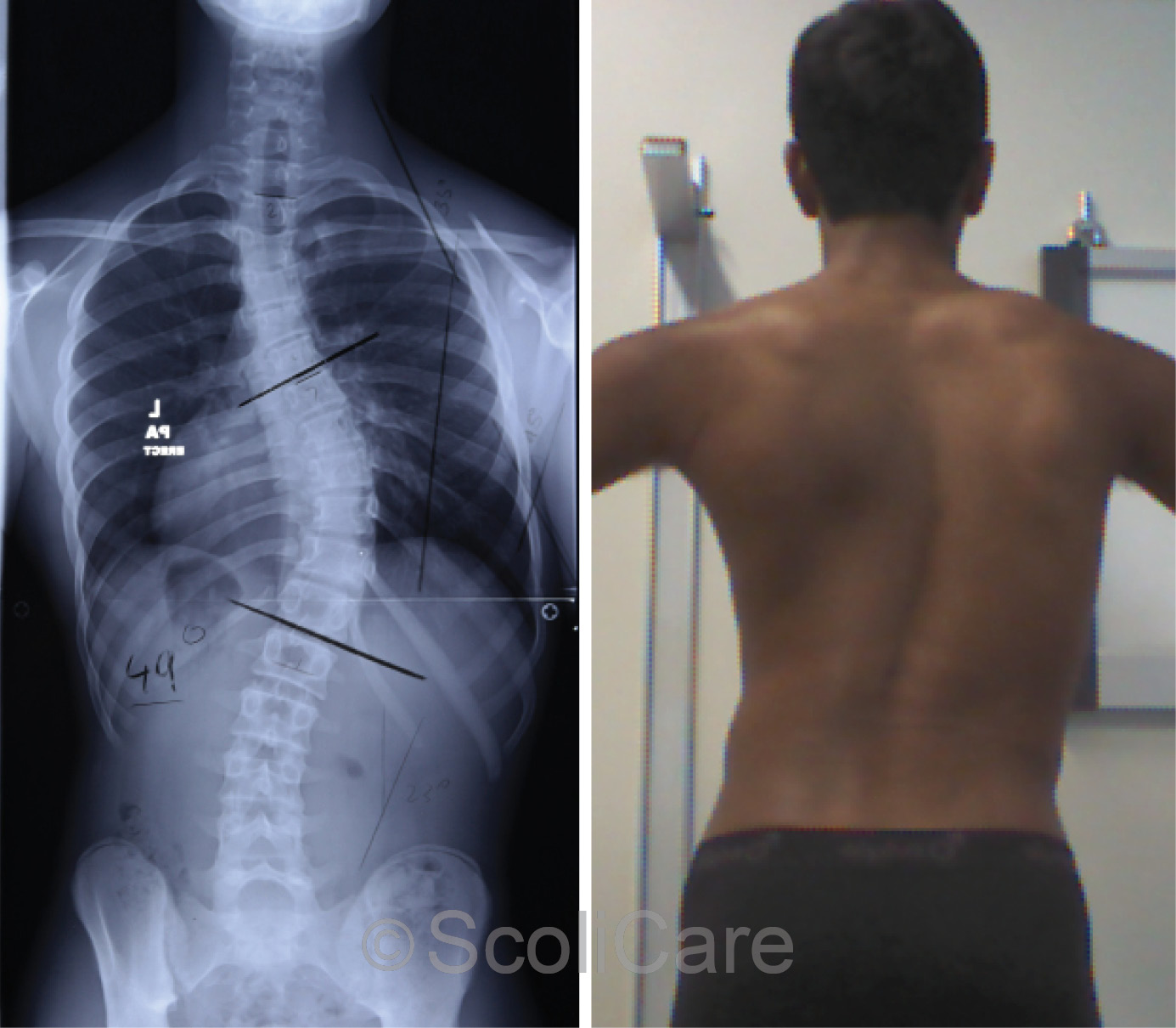 This case demonstrates the management of a young male athlete with a severe scoliosis using a custom 3D designed scoliosis brace and scoliosis specific rehabilitation. The patient presented to the ScoliCare clinic at age 14 with a 49° right thoracic scoliosis. The patient was prescribed the custom scoliosis orthosis to be worn full-time, and taught scoliosis specific exercises and mobilisation techniques to perform at home.
