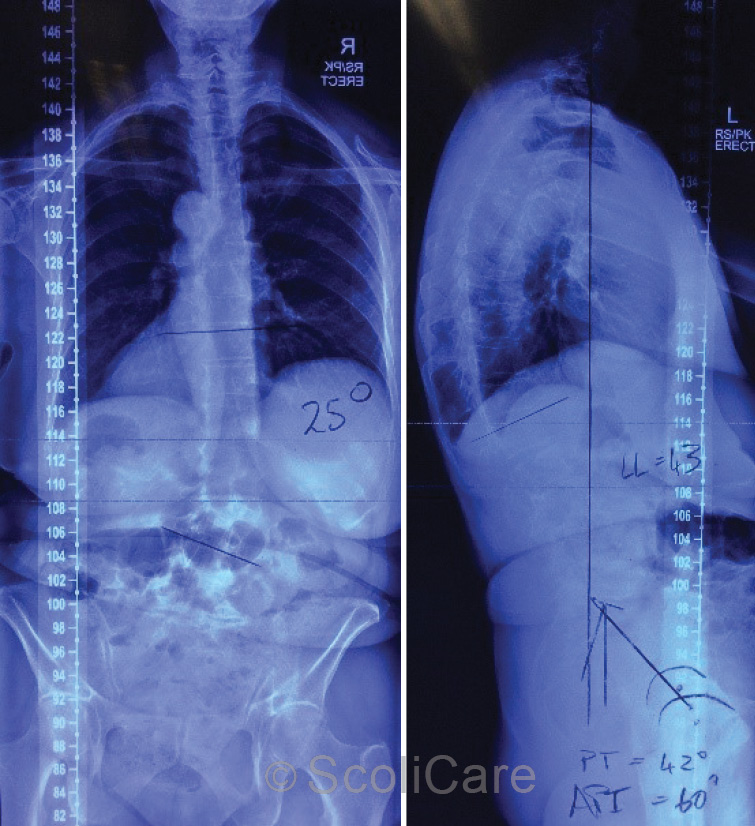 Figure 2: Posteroanterior full-spine x-ray highlighting a 25° (Cobb) right lumbar scoliosis (Left),