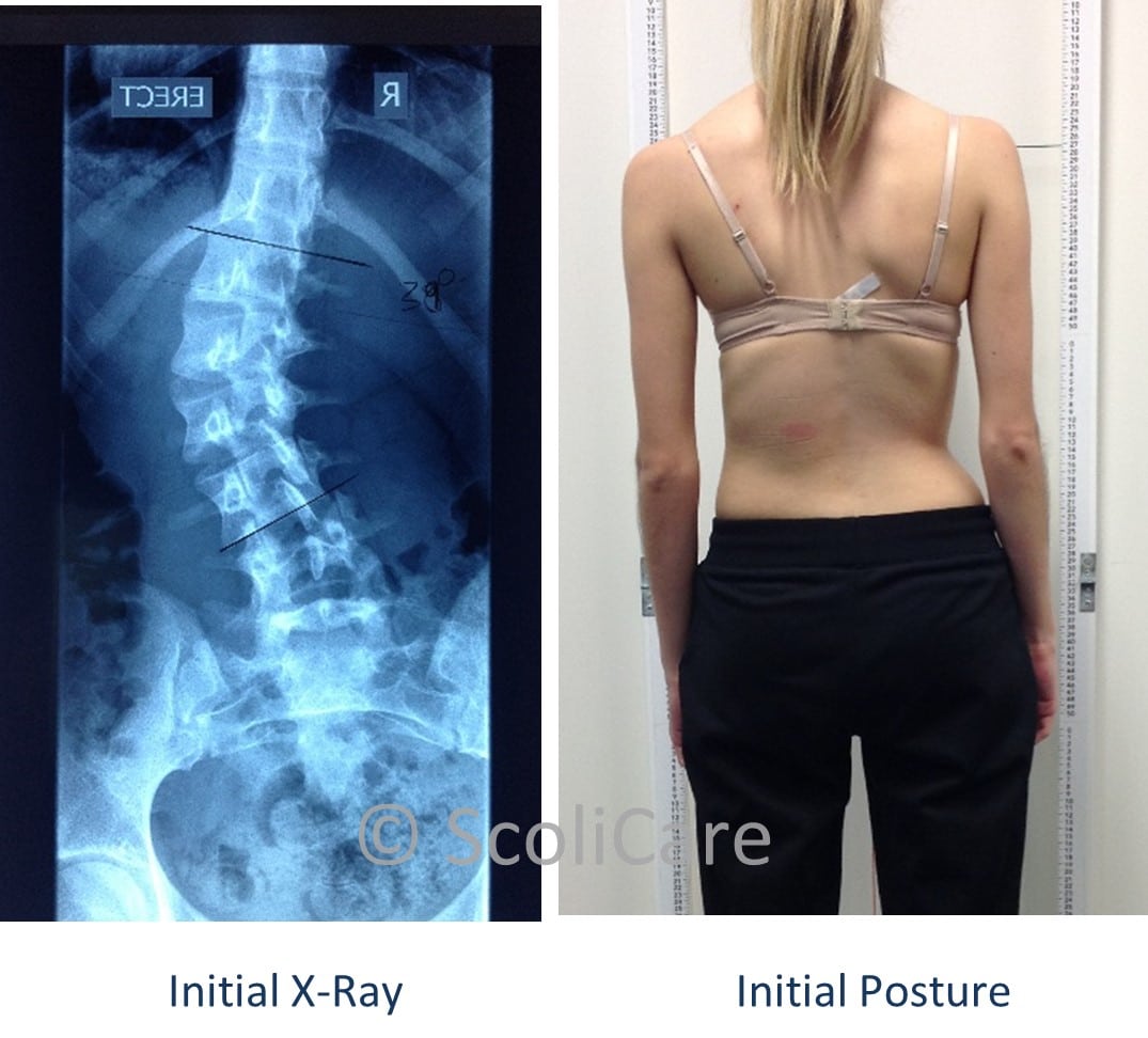 Six ScoliBalance rehabilitation sessions were initially prescribed to help stabilise the curve and decrease pain. The active self-corrections (ScoliCorrections) prescribed to the patient were specific to her scoliosis and other exercises (ScoliExercises) were prescribed to stabilise the corrected posture and improve core and lower back strength and stability.