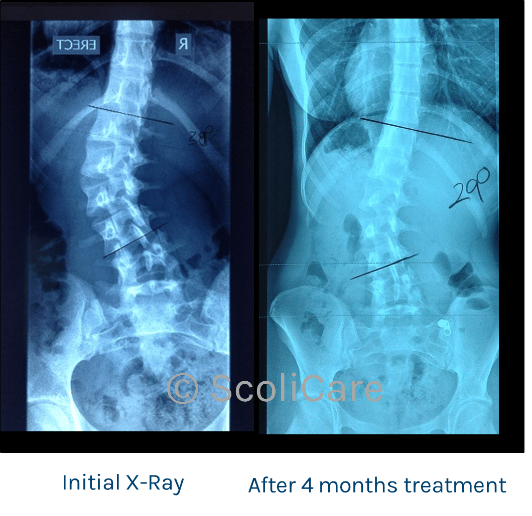 After 4 months of treatment, an X-ray was taken and the curve had reduced from the initial 39 degrees to 29 degrees.